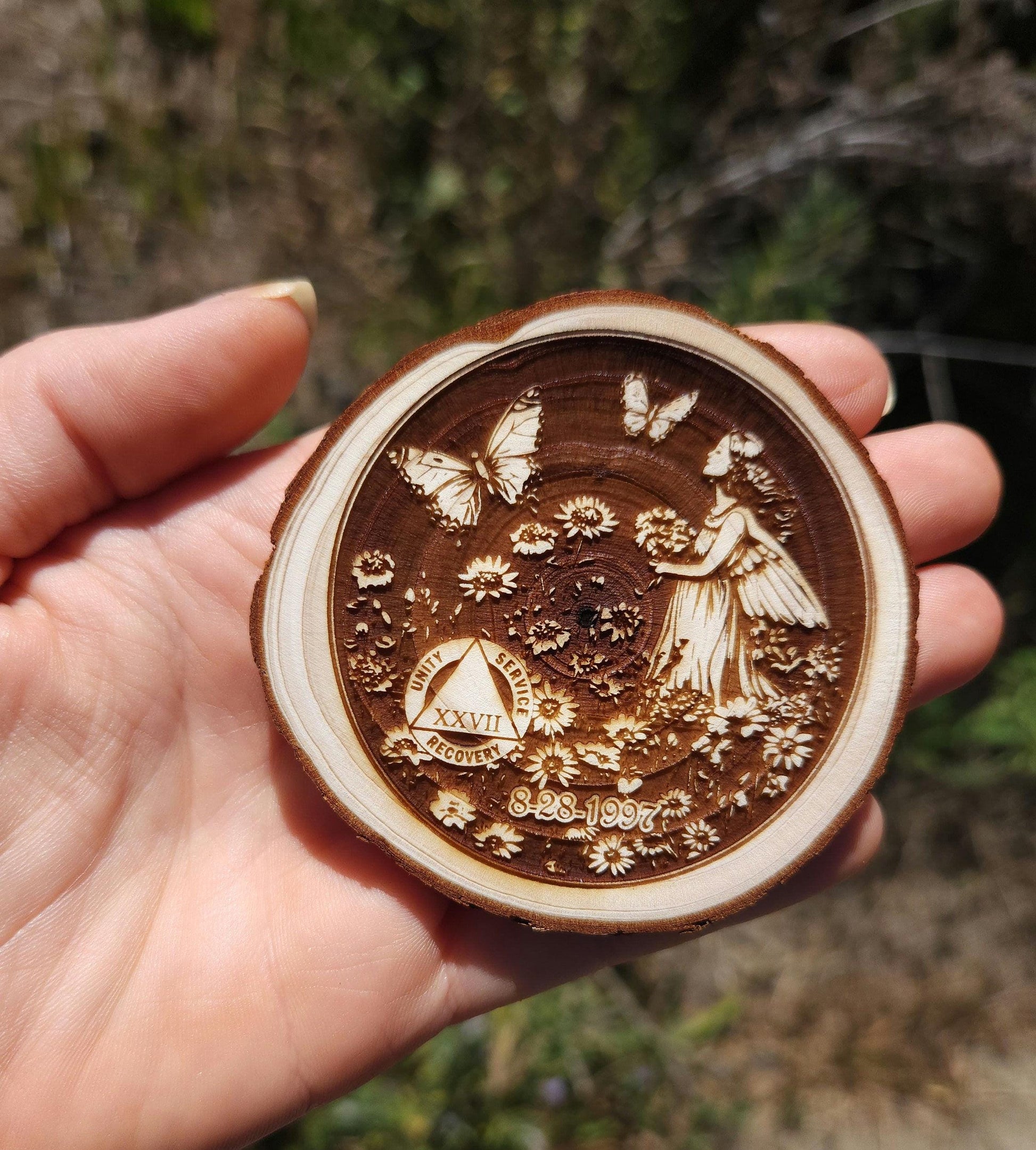 An AA medallion (also called a sobriety chip or token) is a tangible symbol given to mark milestones in addiction recovery. Our wooden medallions are personalized with your sobriety date and recovery program, making them a meaningful keepsake of your journey.